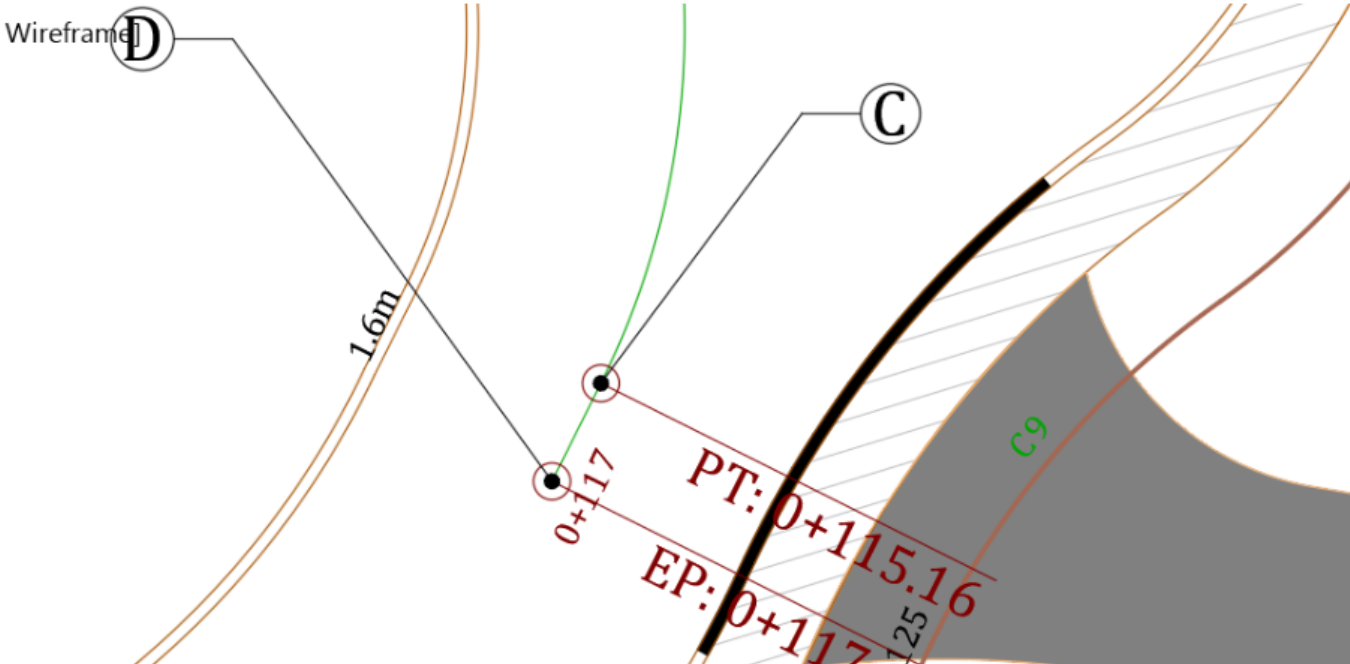 - Now that Point C and Point D are connected, we need to tie Point D to Point E, with an 18.5m or 60ft radius curve. Run the Floating curve (From entity, radius, through point) command from the layout creation tools.