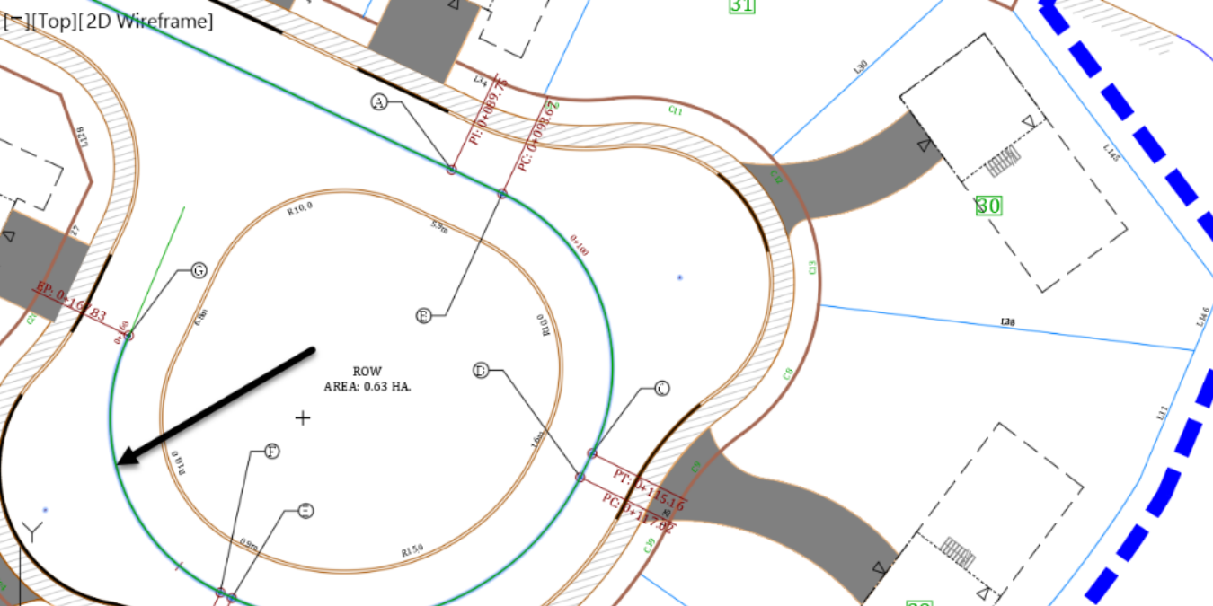 - Now what we want to do is create the centerline alignment of Violets Circle, in the cul-de-sac area. An island with inside curb line has already been created for us during the conceptual phase of the project. We need to create the centerline with a minimum travel way width of 3.5m or 12.5ft, on both ends of the centerline. A few reference points, from A to G, have been created for us to use.