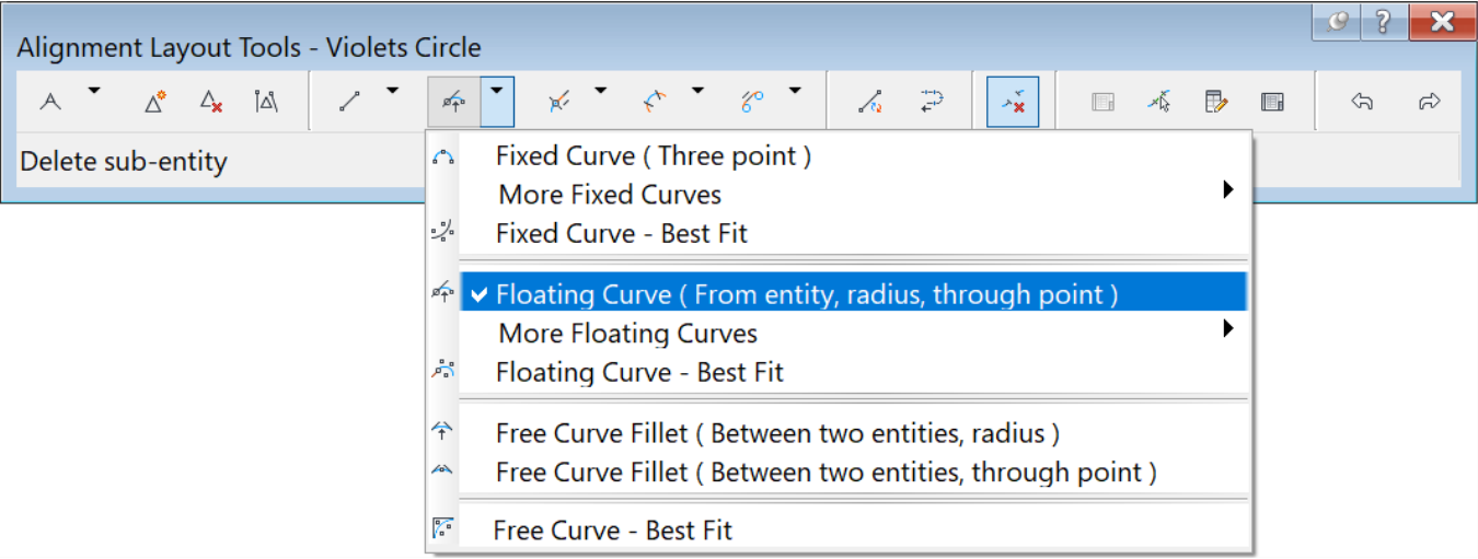 - The command that allows us to do that by using Floating Curve (From Entity end, radius, through point). Once you run the command from the layout tools, you are prompted to select the entity to attach the new curve to. Click on the line between A and B.