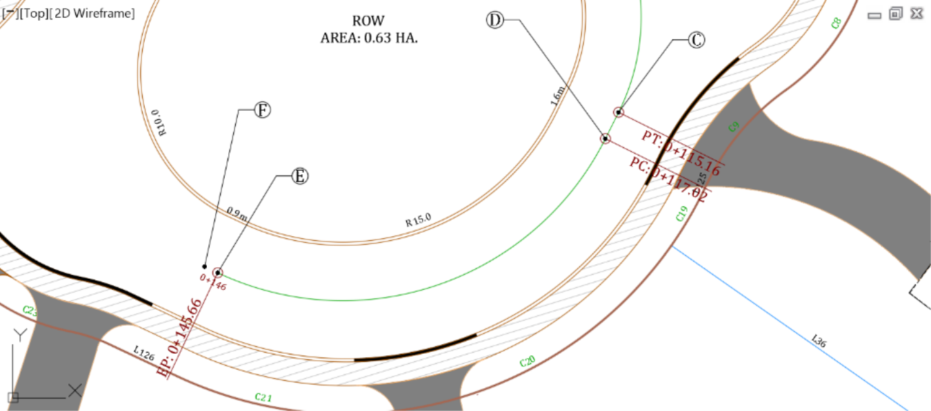 - Next, we will go from PointB to C. Between these two points, the outside radius of the face of the curb is 10m or 35ft. Therefore, we need to create a centerline radius of 13.5m or 45ft. The new curve entity between B and C will also need to maintain a tangency, going from A and B.