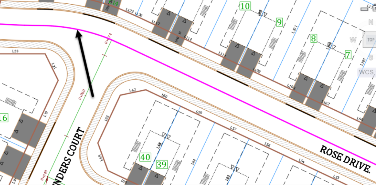 - Select the magenta polyline object at the centerline of Rose Drive. The main site access road and the baseline were already established during Phase 1 of the project. Click towards the western end of the polyline so that the orientation of alignments stations is from West to East. It is always recommended to have alignments run West to East and South to North, to make plans and profiles more readable in layouts.