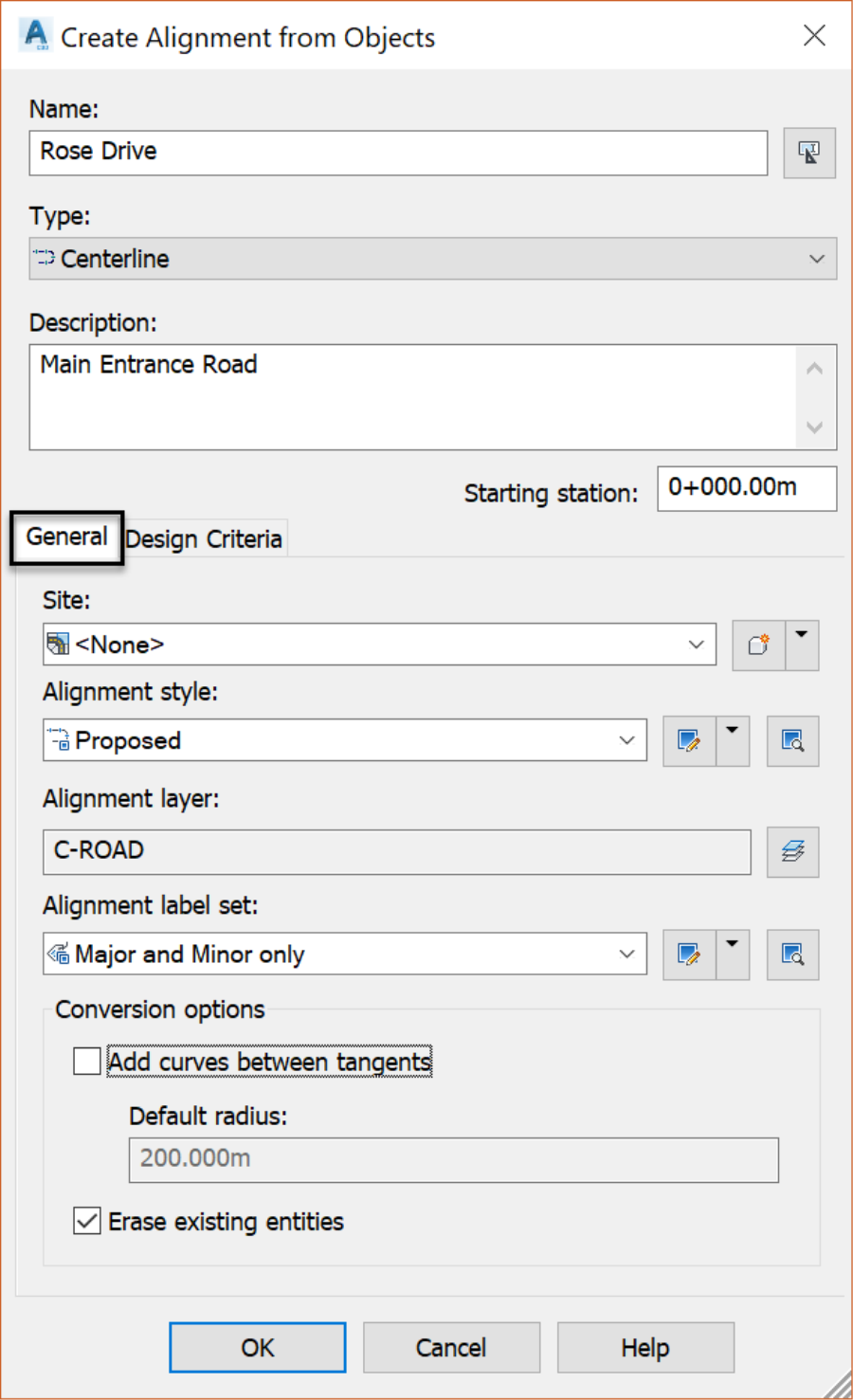 - Finally, check the erase of the existing entities' checkbox to erase the original polylines. Once you create the alignment, the polyline is not needed anymore and can be disregarded. If for any reason we need it, we can simply offset the alignment to recreate it.