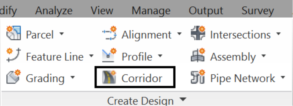 - Click the CorridorCreation command, on the ribbon, in the Create Design Panel of the Home tab.