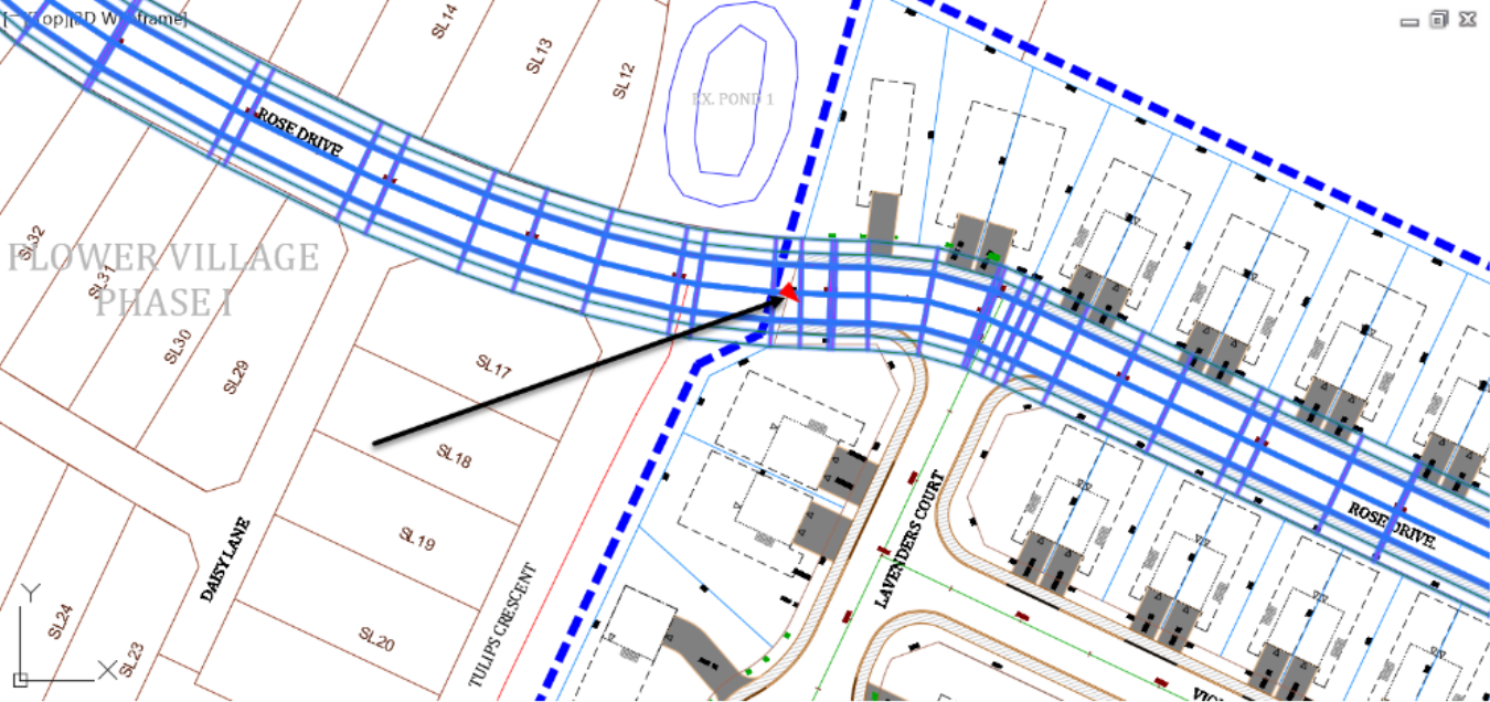- If you zoom to the Rose Drive road area, you will notice that the corridor has now been created. It extends further than needed, to the previous phase of the project to the west and to undeveloped lands to the east. This is simply because we haven’t set any parameters when creating the corridor, so it simply defaults to the full length of the alignment.