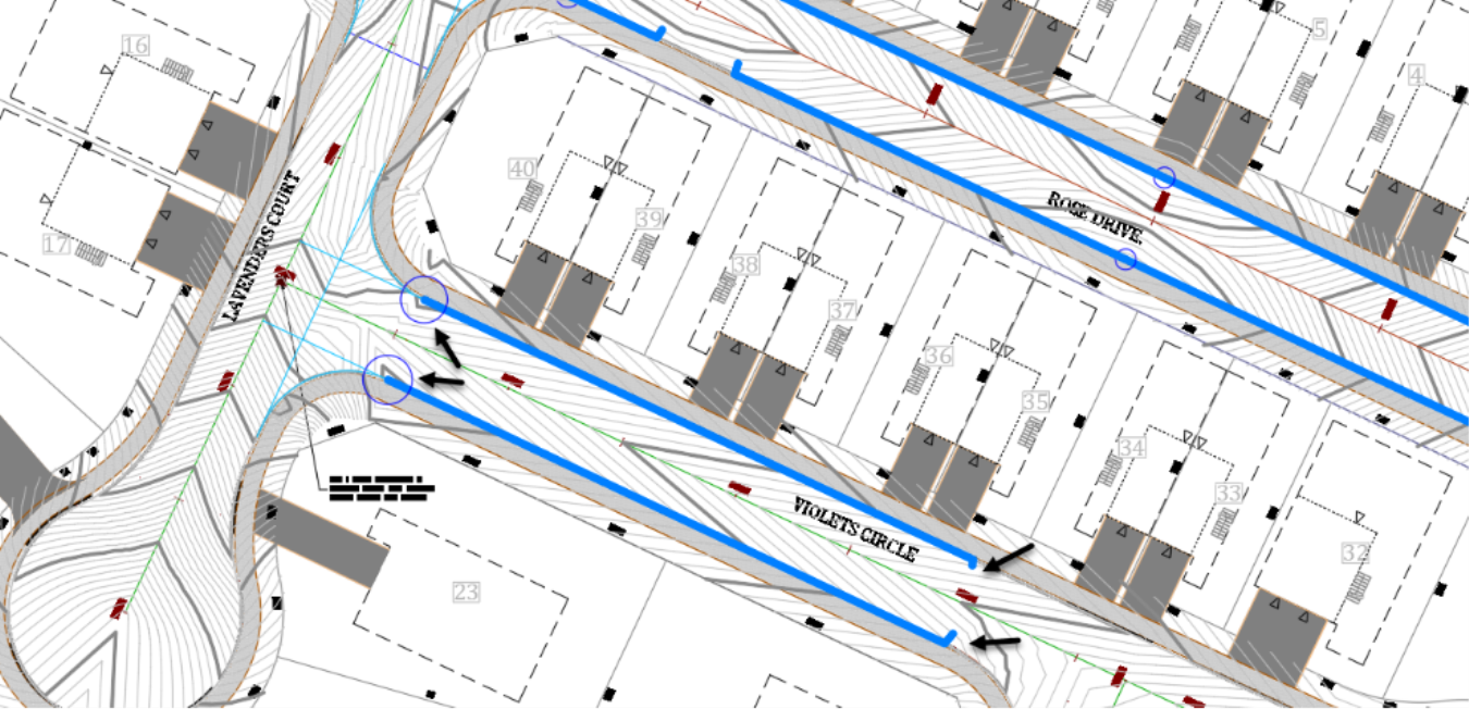 - Next, create the Water Drops, on the linear section of Violets Circle. The low points are located all the way to the start of the curve at the intersection with Lavender Court. These will be two ideal locations to install catchbasins and catch all the flow coming from up top.