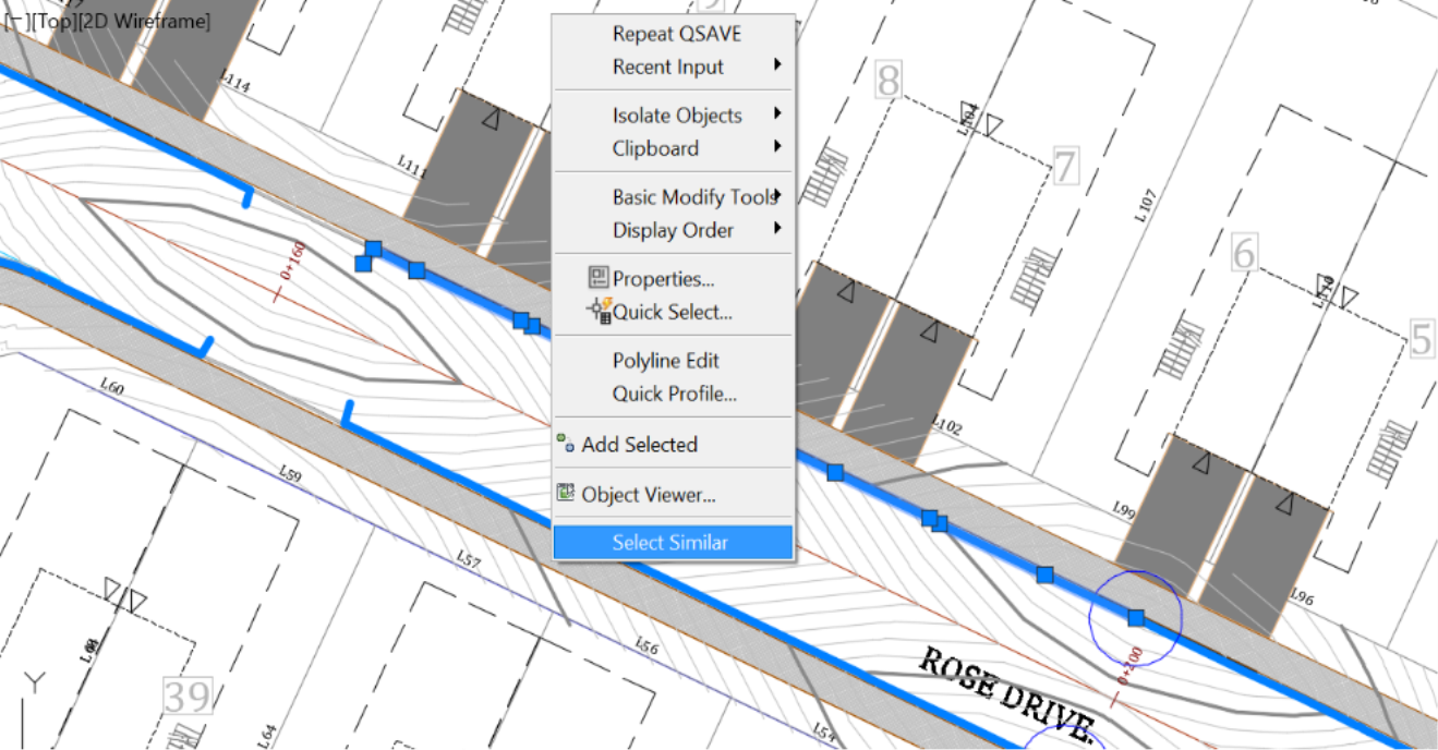 - This process gives us a preliminary idea of how to lay out our storm sewer system. Before moving on to the next thing, let's clean up the clutter we have created with the water drop lines. Select one of the lines, right-click, select similar and delete from the keyboard. The select similar allows selecting entities sharing similar properties. We facilitated their selection by creating the water drop lines using 3D polylines and putting them on the watershed layer. Few other objects have these properties. On the other hand, we will not delete the circles, as we still need them to place our catchbasins