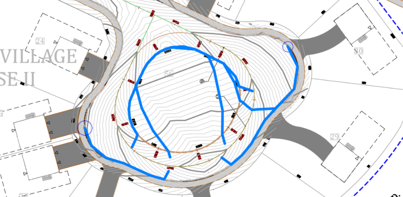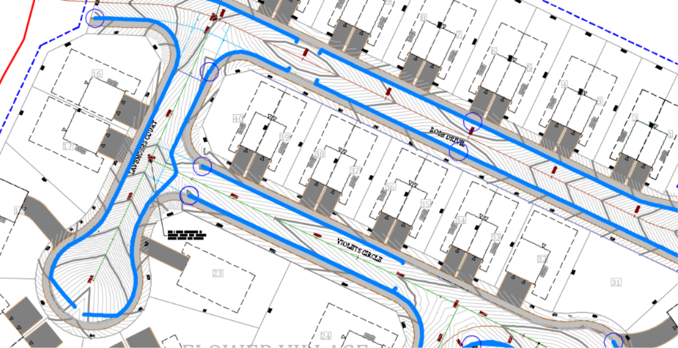 - Next, repeat the same process for Lavender Court and Violets Circle, starting at the end of the cul-de-sacs. For example, for Violets Circle, let’s put a couple of water drops on each side of the high points around station 0+132m or 0+430ft. You will notice the two low points in the cul-de-sac.