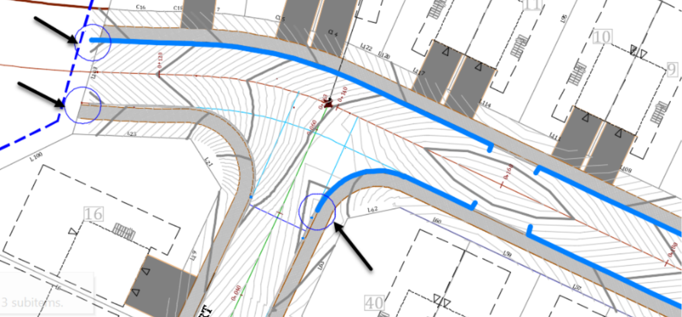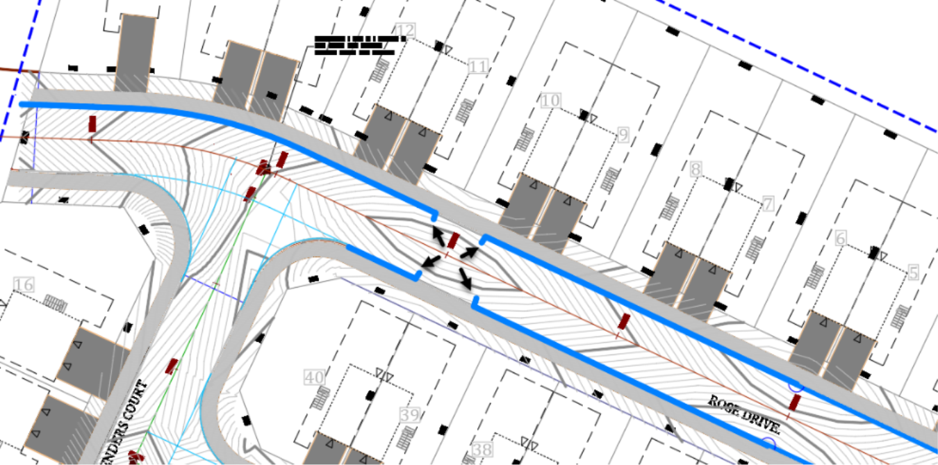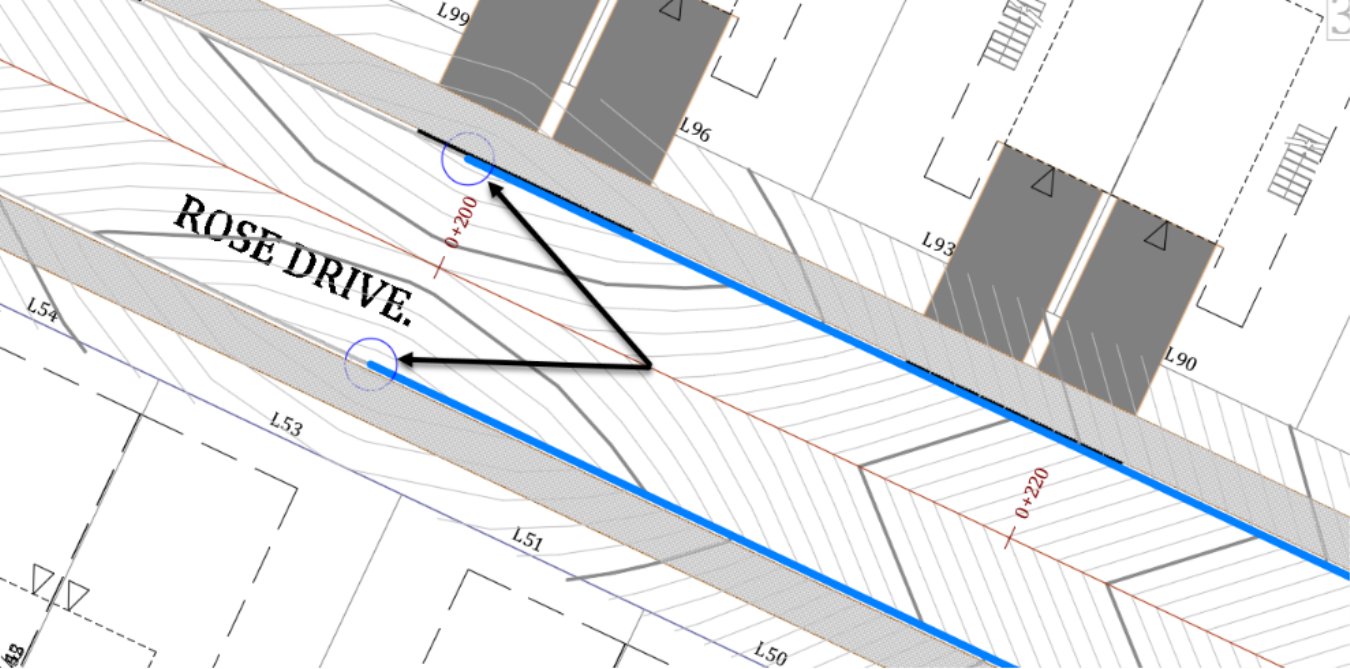 - On the north side of Rose Drive centerline, water is flowing toward the western end of the site. Therefore, a catchbasin needs to be installed at that station on the north and south side of the street centerline, exactly at the site boundary. On the south side of Rose Drive, the flow path is stopping approximately at the start of the southeast quadrant of the intersection.
