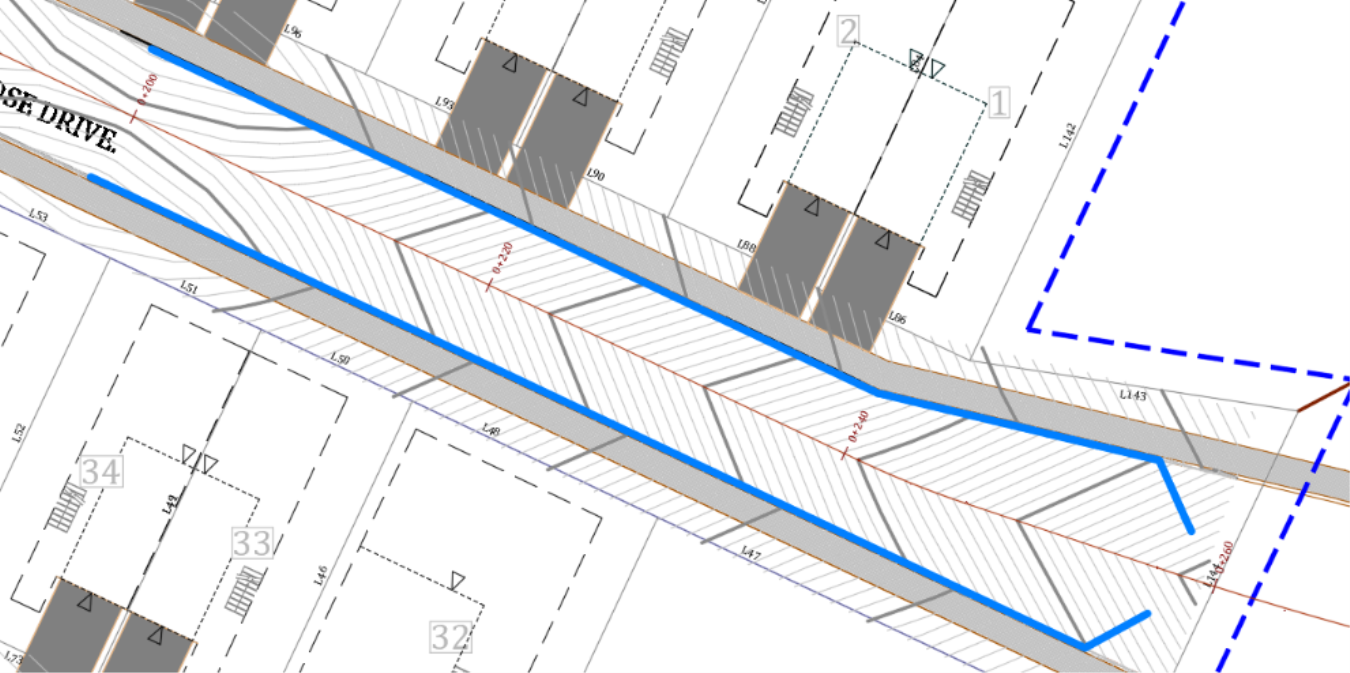 - Next, click on the eastern end of Rose Drive, on both sides of the centerline, around station 0+260m or 0+850’. You will notice a flow line running along the curb line on both sides of the road. These represent the path that a water drop would take along the street all the way to the lowest point in the area.