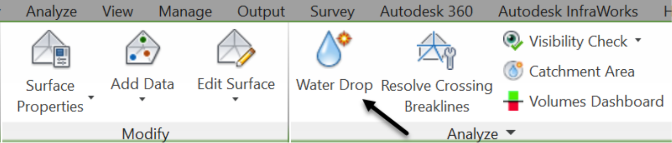 - In previous lessons, we have already designed a proposed surface for Roses Drive, using a proposed profile. The profiles will also allow us to determine low and high point locations. As a requirement of the stormwater system design, we need to make sure that we put catch basin inlets at every low point, on the street. We can thus collect rainfall runoffs. To identify these points, we can use the profile and create low point labels on the street alignment. But an easier and more visual way is to use the Water Drop tool we talked about in the lesson on surfaces. Let’s run the Water Drop command by selecting our design surface. It’s worth mentioning that the design surface is still temporary as we haven’t done any grading at the lot level yet. However, we are done with the street portion of the surface. You can see the finalized corridor by turning on the C-Road-Corridor layer, from the layer manager. Look at it and turn the C-Road-Corridor layer backoff.