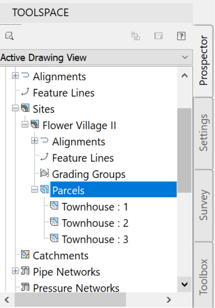 - While we are focused on creating parcels in the drawing areas, the database is being updated with new information. Let's check it. In the Prospector, expand the Flower Village II site collection.
