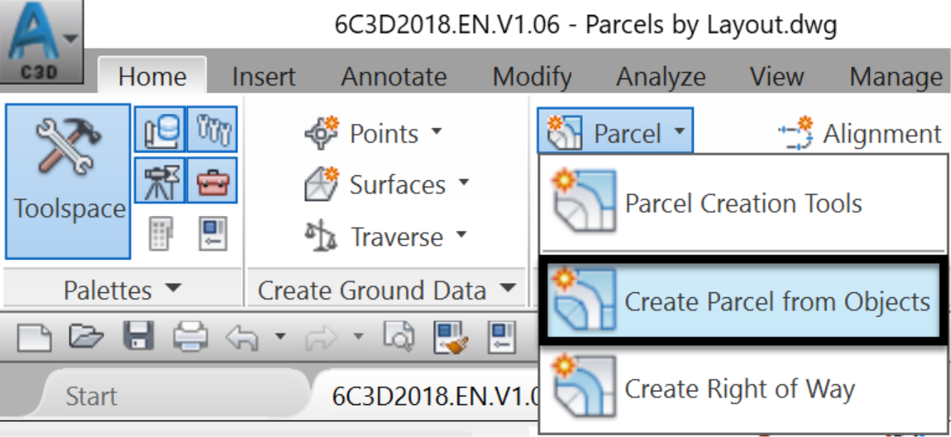 - Create a parcel from the main lot (blue boundary line). To do that, from the Ribbon, click on the parcel command and Create from Object from the drop-down menu.