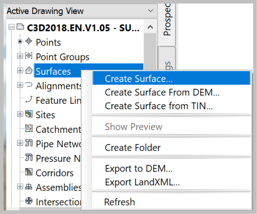 - From the Ribbon or the Prospector, create a new surface: