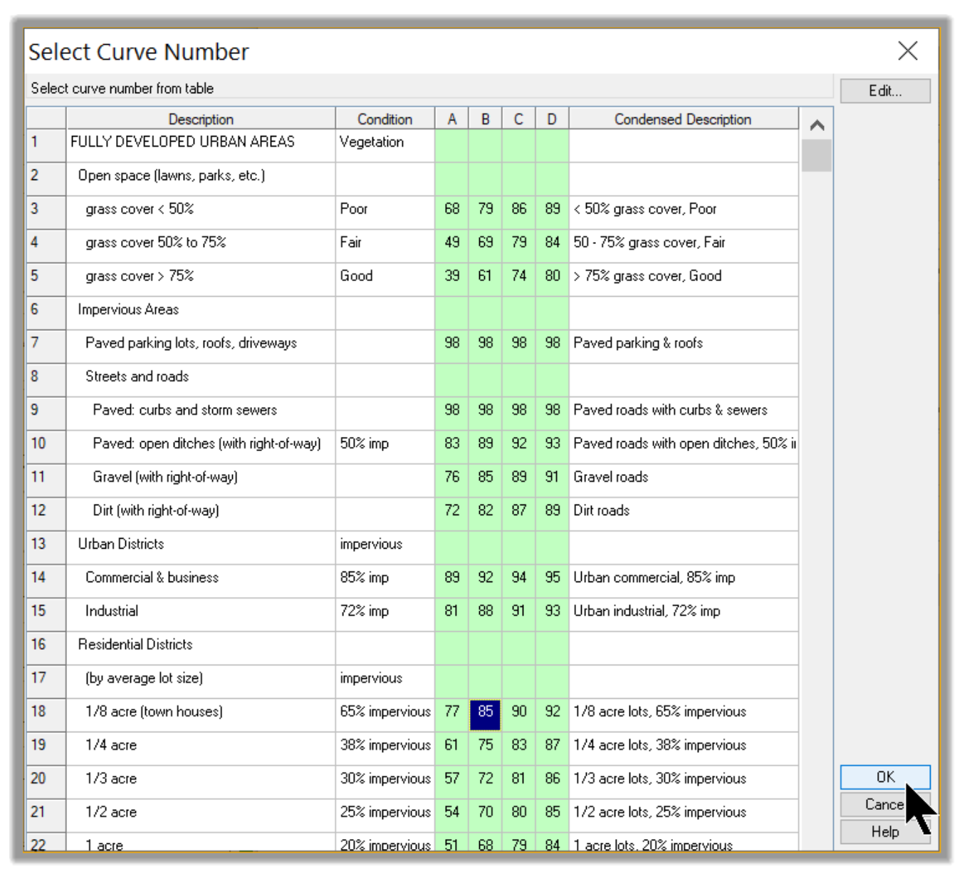 - For this project, we already know that the development will be townhouses, and the type of soils will be a Group B type of soils. Therefore, the Curve Number is determined to be 85 in the post-development conditions. Select the corresponding value and click ok.