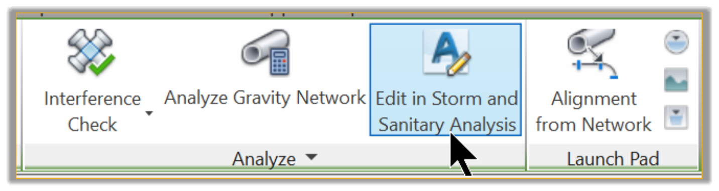 - On the ribbon, run the Edit in Storm and Sanitary Analysis command, the Analysis panel of the ribbon. This will export the network directly to SSA.