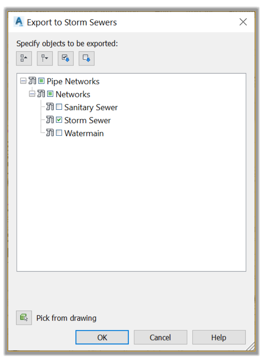 - Uncheck the Sanitary and Water networks. We will only need the stormwater component for this analysis.