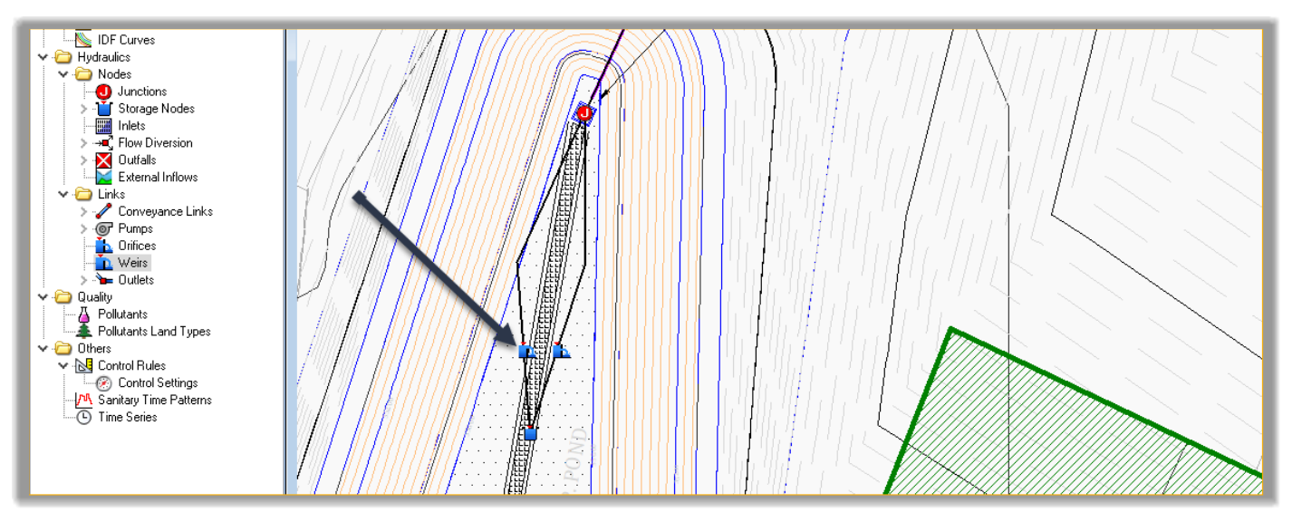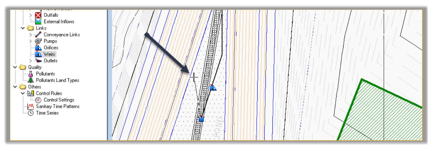 - Next, click on an intermediary point between the Junction and the control structure. We are doing this, so we don’t have the weir sitting on top of the orifice. This will not impact the calculations, but it allows us to easily select each element.
