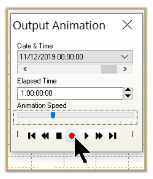 - The Output Animation dialog player is displayed with the control button to play, pause, record, forward, rewind.
