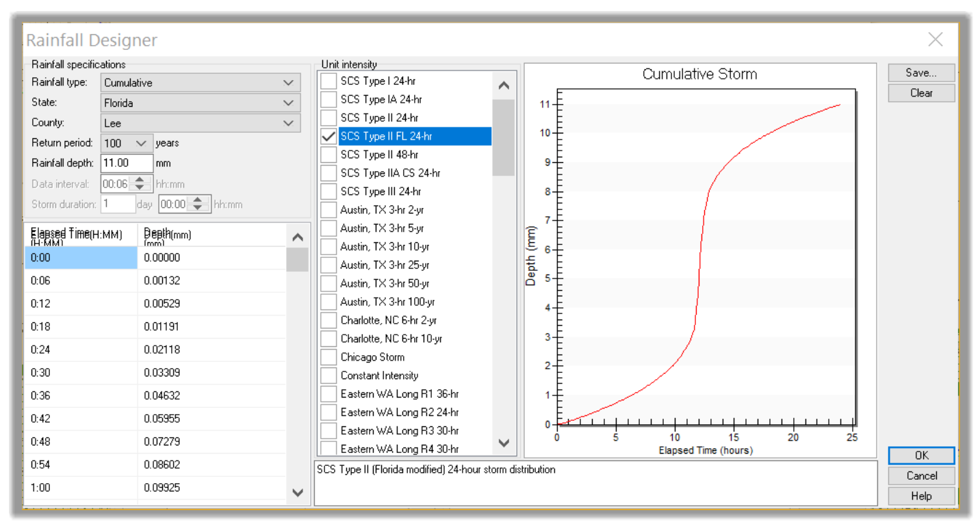 - To use the Rainfall Designer, we only need to know the location of the project and the required distribution method. Let’s say our project is located in Lee County, Southwest Florida. We would then choose the State, the County, and the 100-year return period. Since we are in Florida, we can then choose the SCS Type II FL 24-H distribution. This automatically generates the 24-hour rainfall time series.