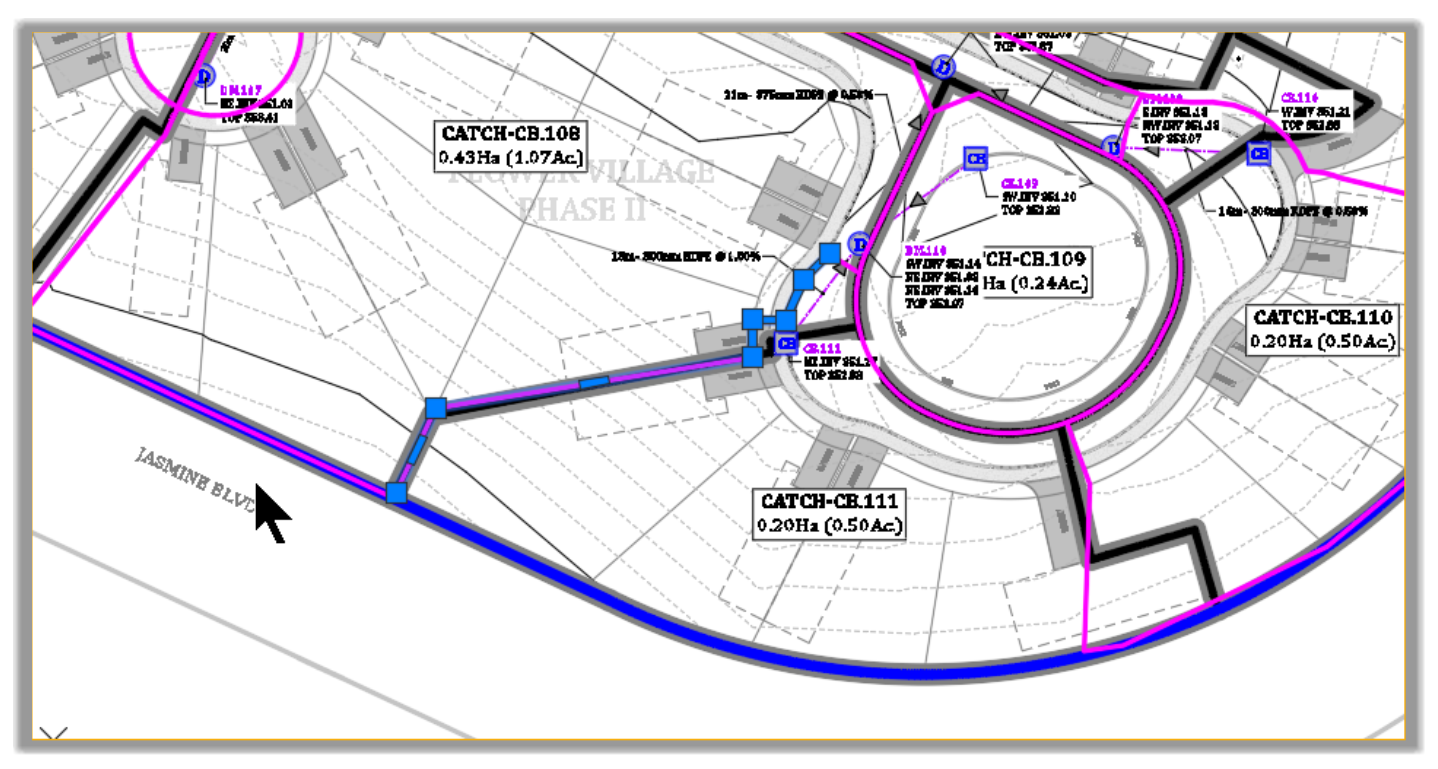 - Next, we will need to click on the catchbasins (CB.10X) to determine the catchment area for each one of them. Let’s note that we will not need to click on the Manhole (DM.10X). Now start by clicking on catchbasin CB.101, on Rose Drive. Make sure you click the closest possible to the center of the CB.
