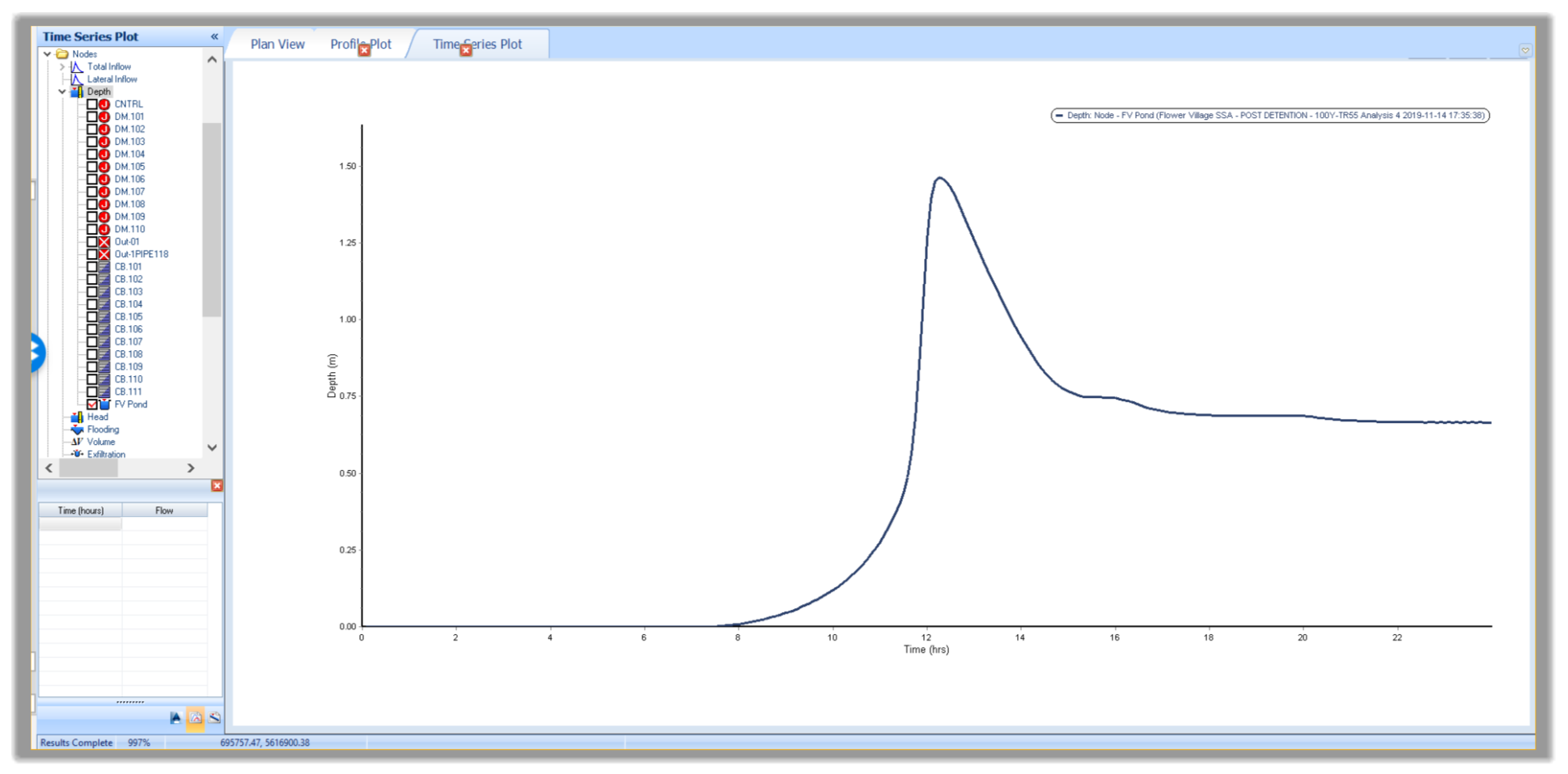 - Let’s also add the flow graphs. Click on each of the nodes you would like to show a graph for. Let’s go ahead and select as many nodes as we want. Notice how the profile plot is split to show both flows and depth in the same view.
