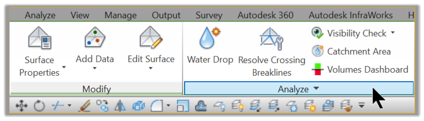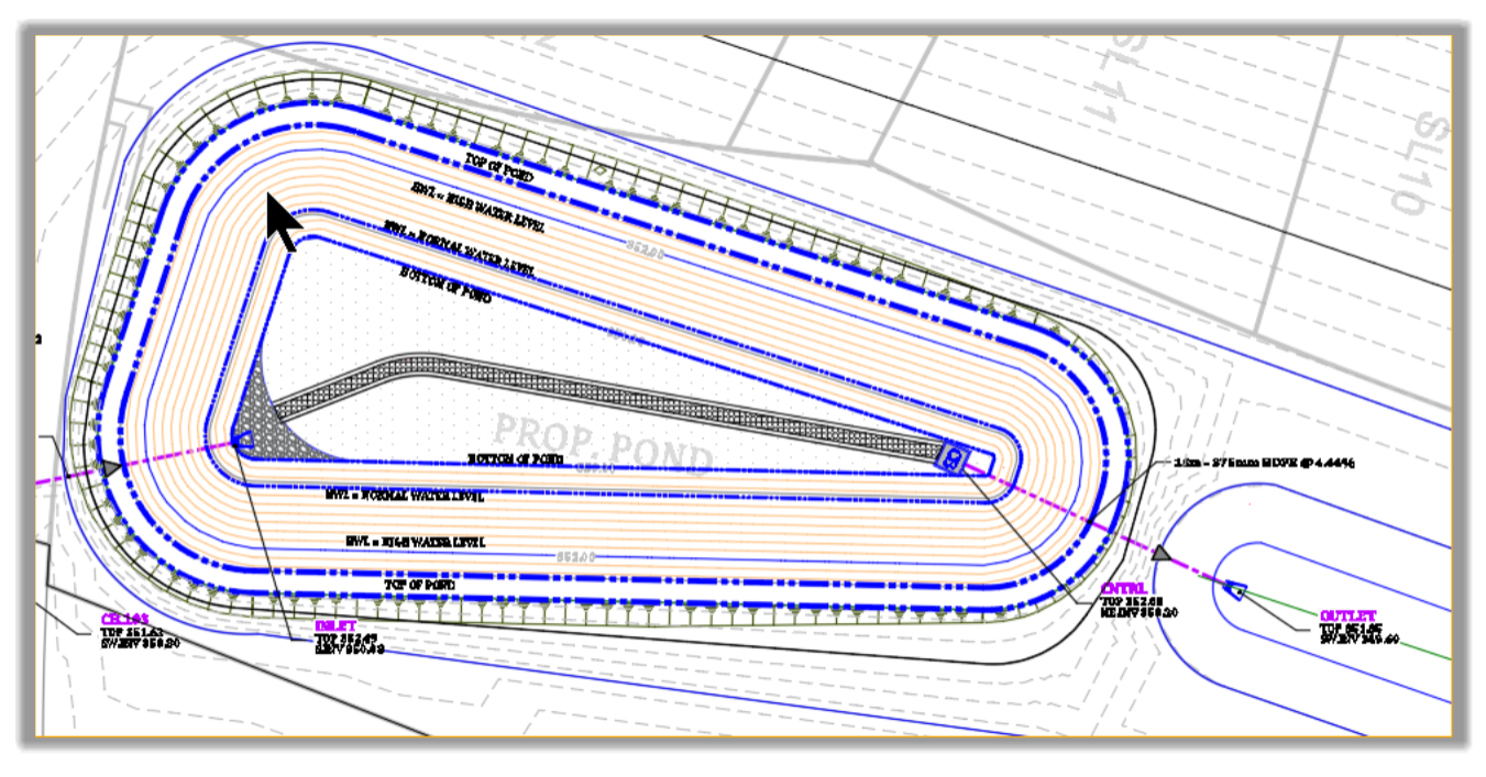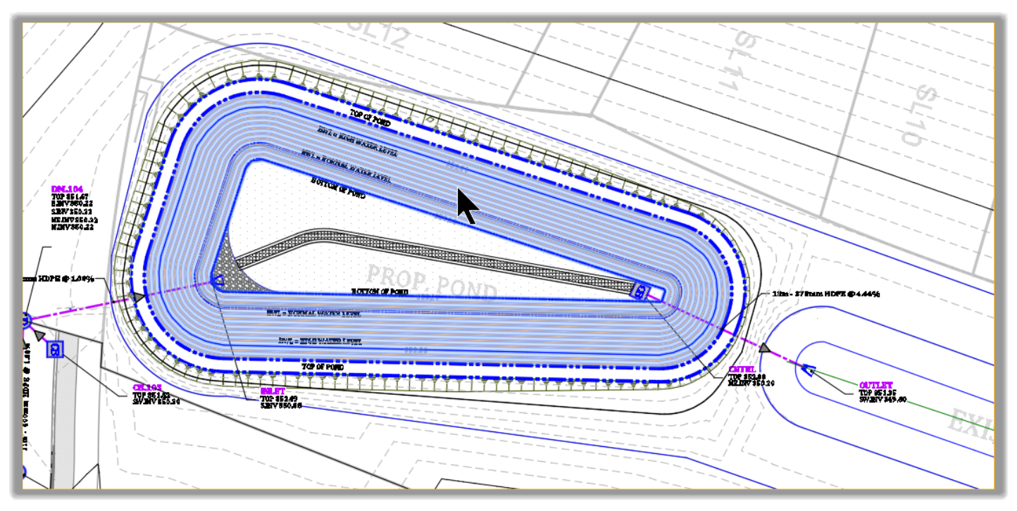 - First, open the Civil 3D file 02.01-STAGE STORAGE.dwg containing the temporary pond grading. The pond surface is assigned a contour style. It is essential to display a contour surface style in order to be able to extract stage storage information.