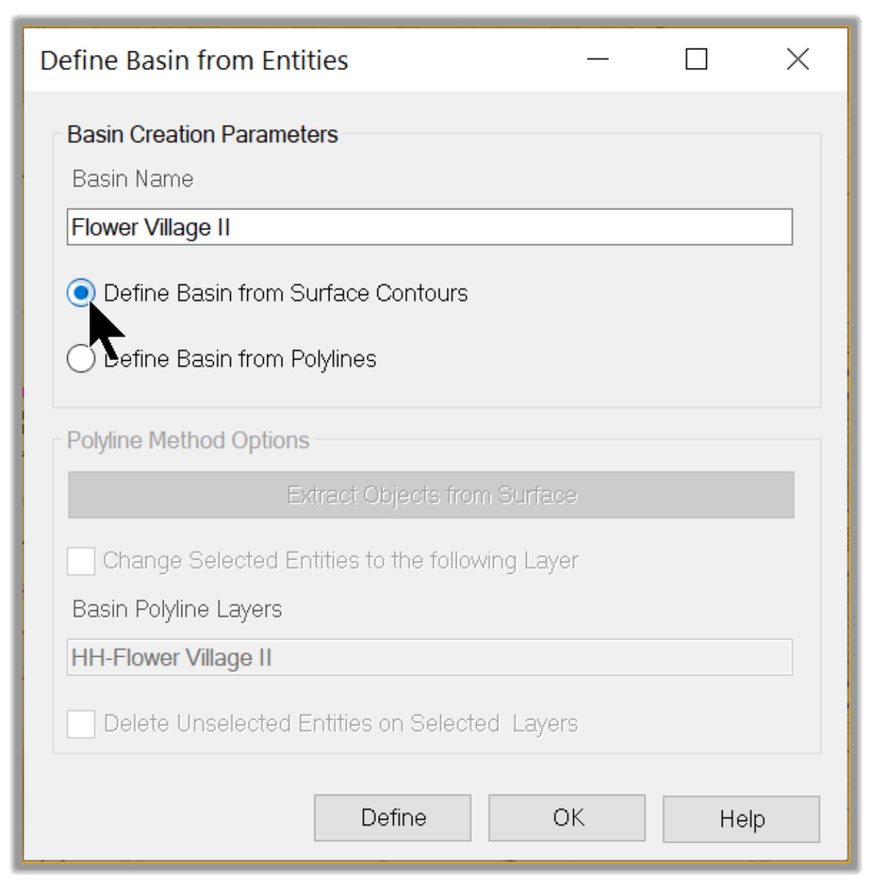 - Next, click on the Define Basin button. In the Define Basin from Entities dialog box, select Define Basin from Surface Contours.