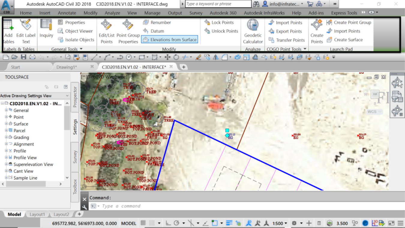 - While working in the same interface drawing, zoom to a survey point, for example, one of the EG points to the northwest of the proposed site. Take note of the current state of the Ribbon with the Home tab activated.